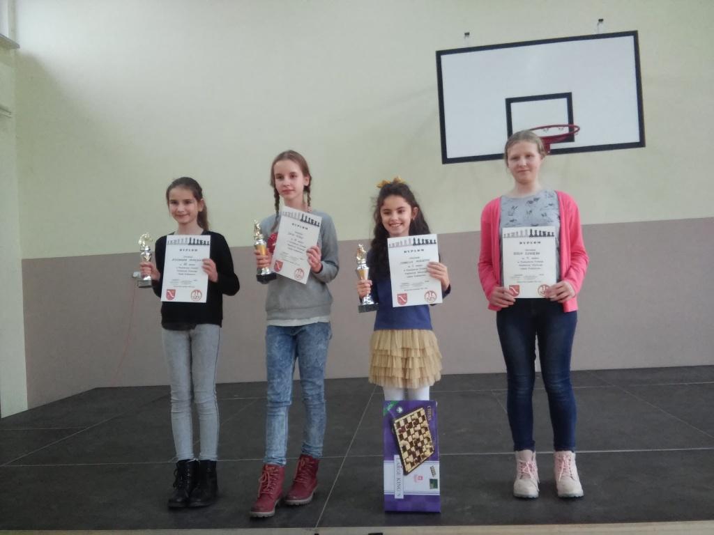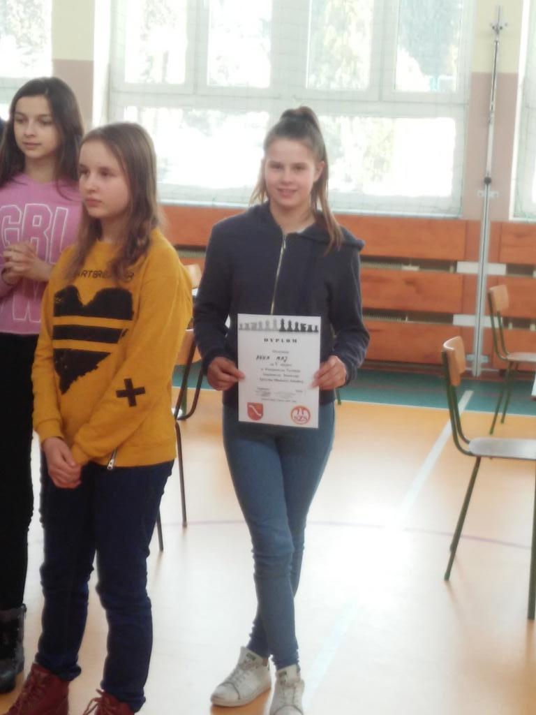 Szachy powiat szkoły podstawowe Daria Pióro IIm, Aleksandra Okrajek IIIm i Giulia Gorzęba Vm