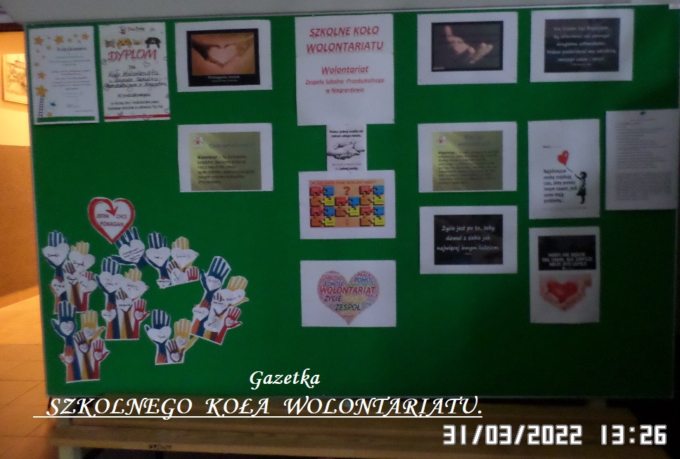 Wiadomości o działalności SZKOLNEGO KOŁA WOLONTARIATU znajdziemy na nowej gazetce szkolnej znajdującej się obok klatki schodowej.