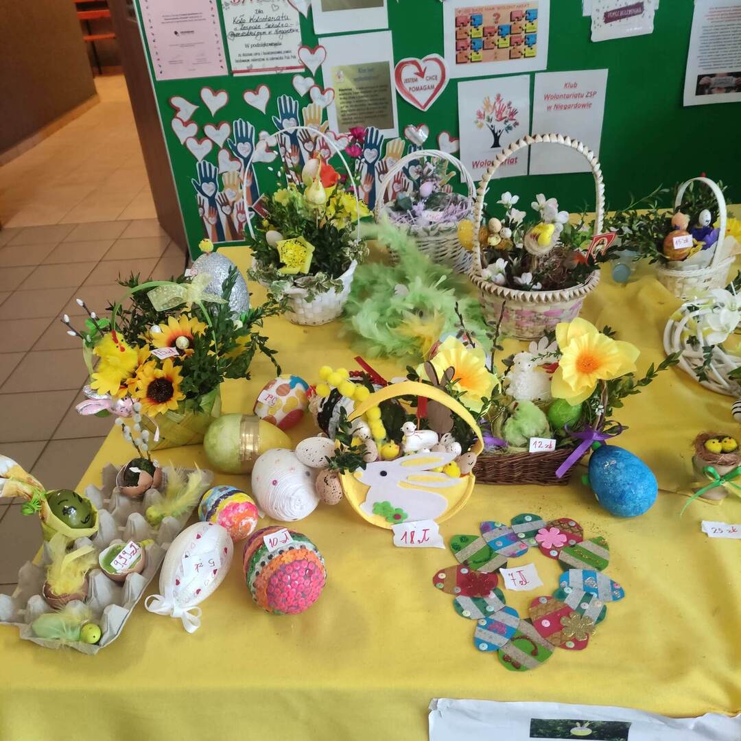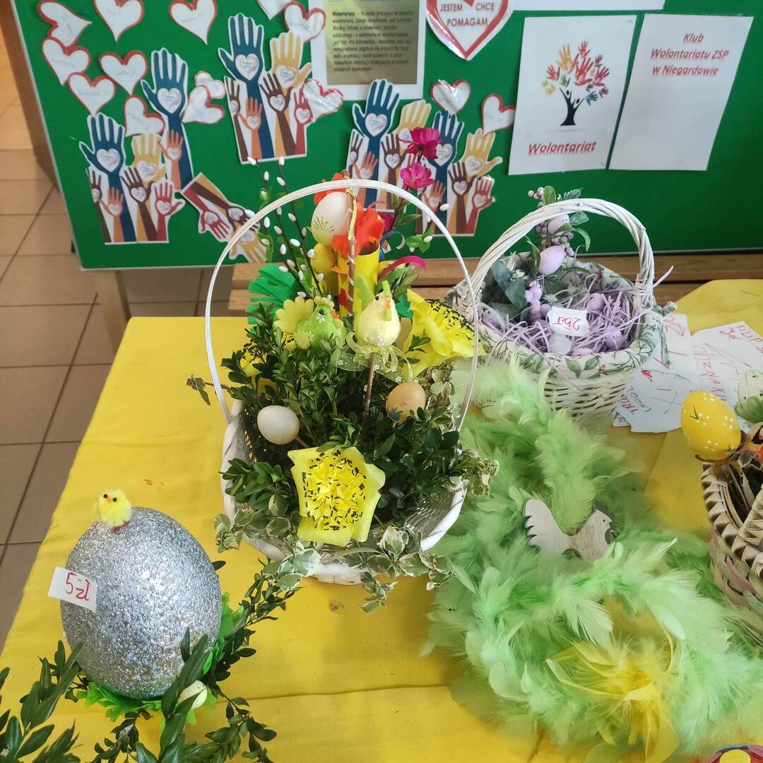Kiermasz Wielkanocny - jak co roku koło wolontariatu organizuje kiermasz,na którym są sprzedawane ozdoby wielkanocne wykonane własnoręcznie przez uczniów kl.4-7 na lekcjach plastyki. Ze sprzedaży będzie zakupiony sprzęt sportowy do naszej szkoły. Zapraszamy do udziału w aukcji.