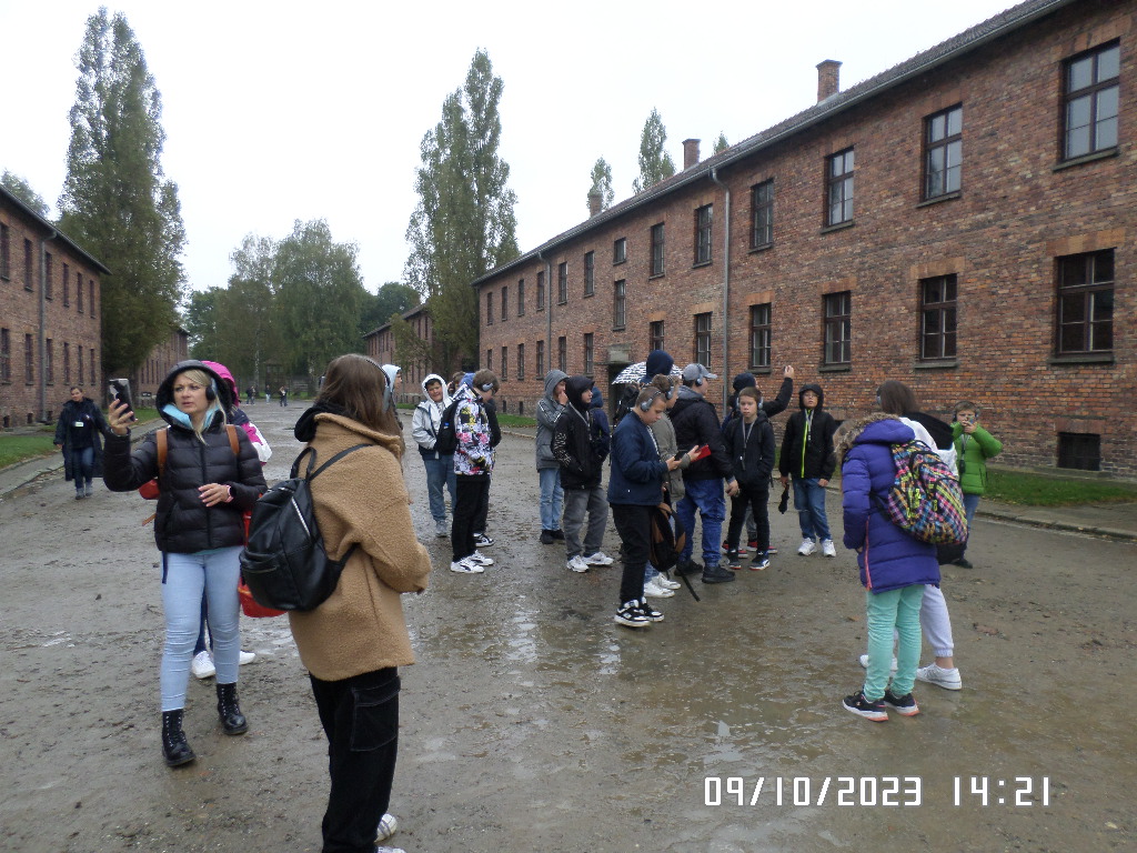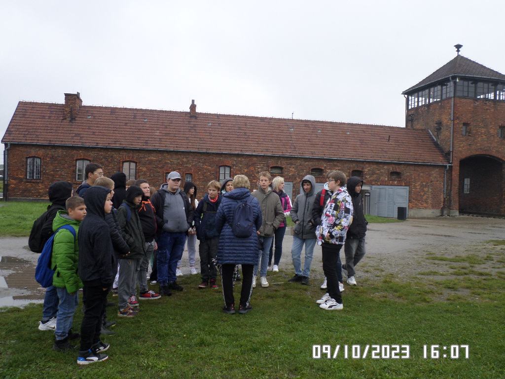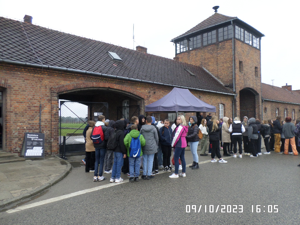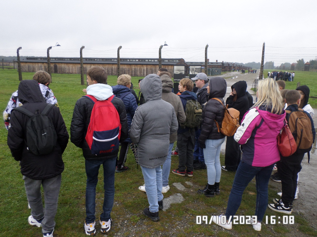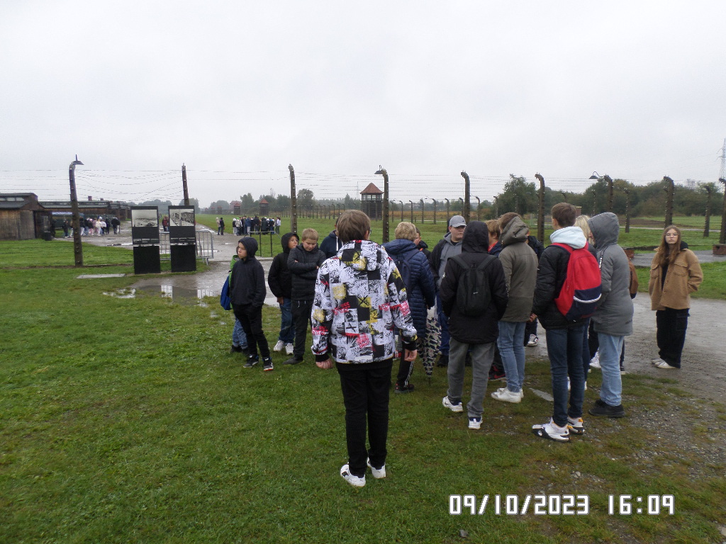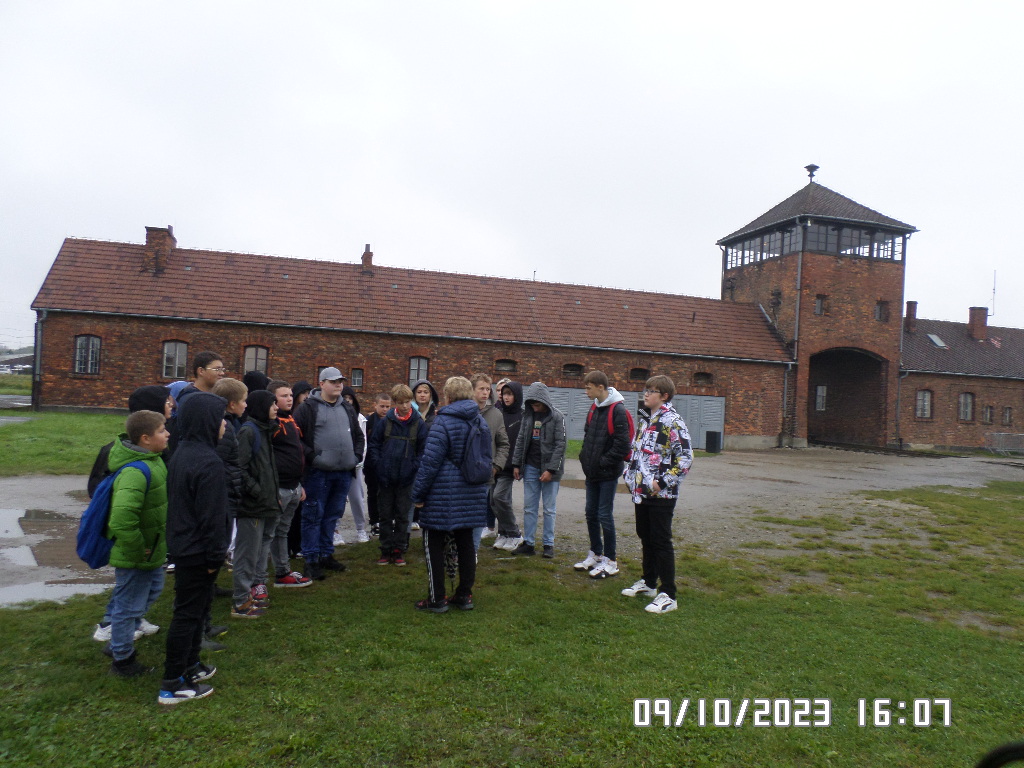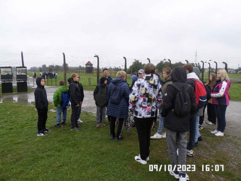 Dalsza część wycieczki to zwiedzanie niektórych miejsc i wystaw na terenie obozu koncentracyjnego Auschwitz Birkenau oraz na terenie obozu w Brzezince. To była trudna i ważna lekcja historii dla uczniów... W ciszy i zadumie słuchali oni informacji przekazywanych przez przewodnika. Te informacje oraz oglądane miejsca, przedmioty i obrazy z obozowego życia więźniów wzbudziły u uczniów wiele emocji, wiele głebokich refleksji, przemyśleń i wiele pytań ... Uczniowie zatrzymali się na chwilę przed ścianą śmierci, gdzie zapalili znicz.