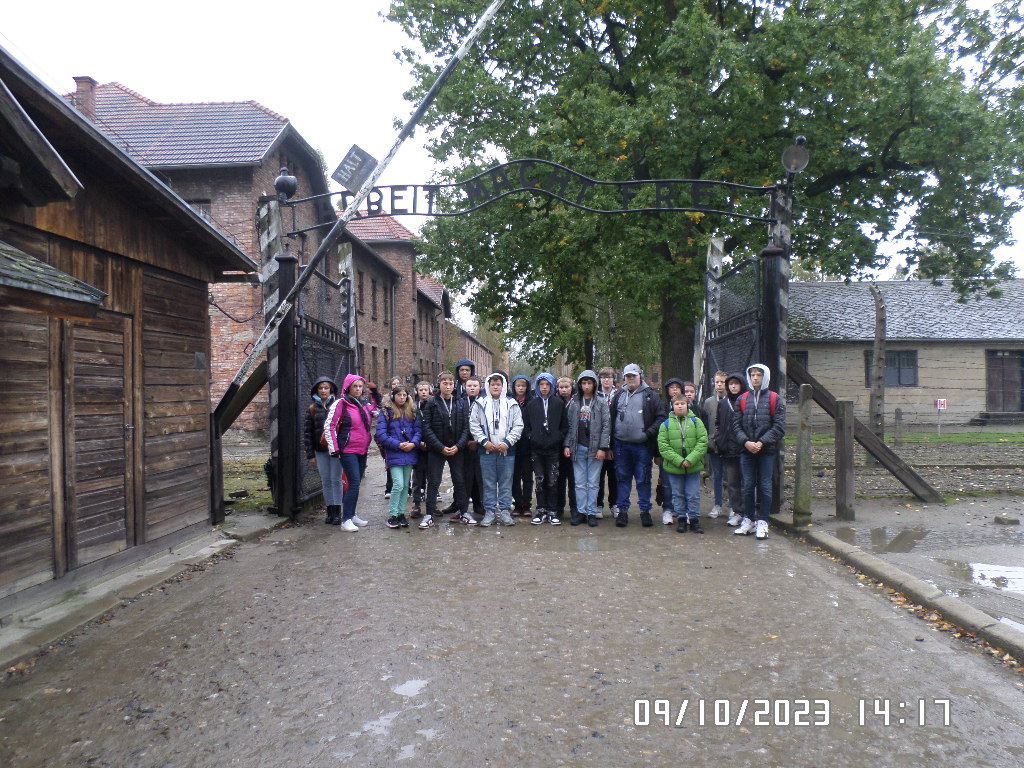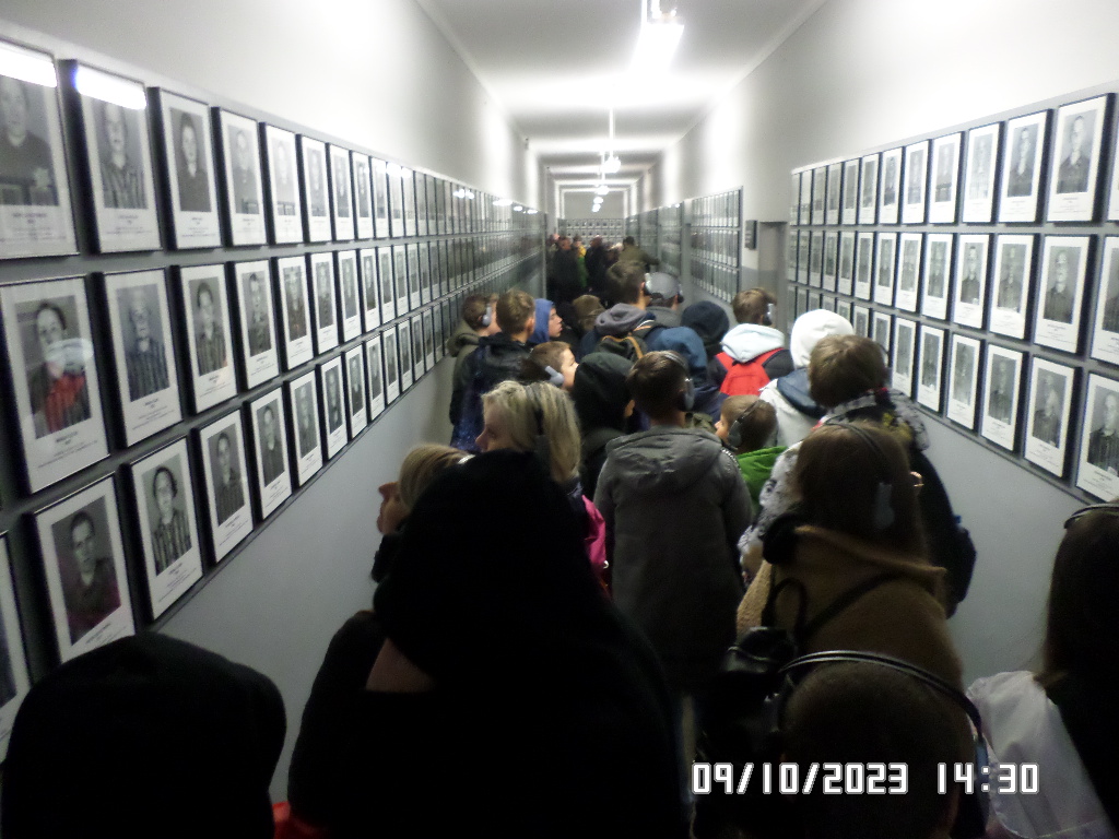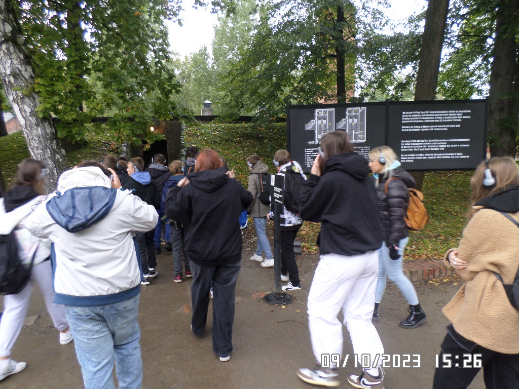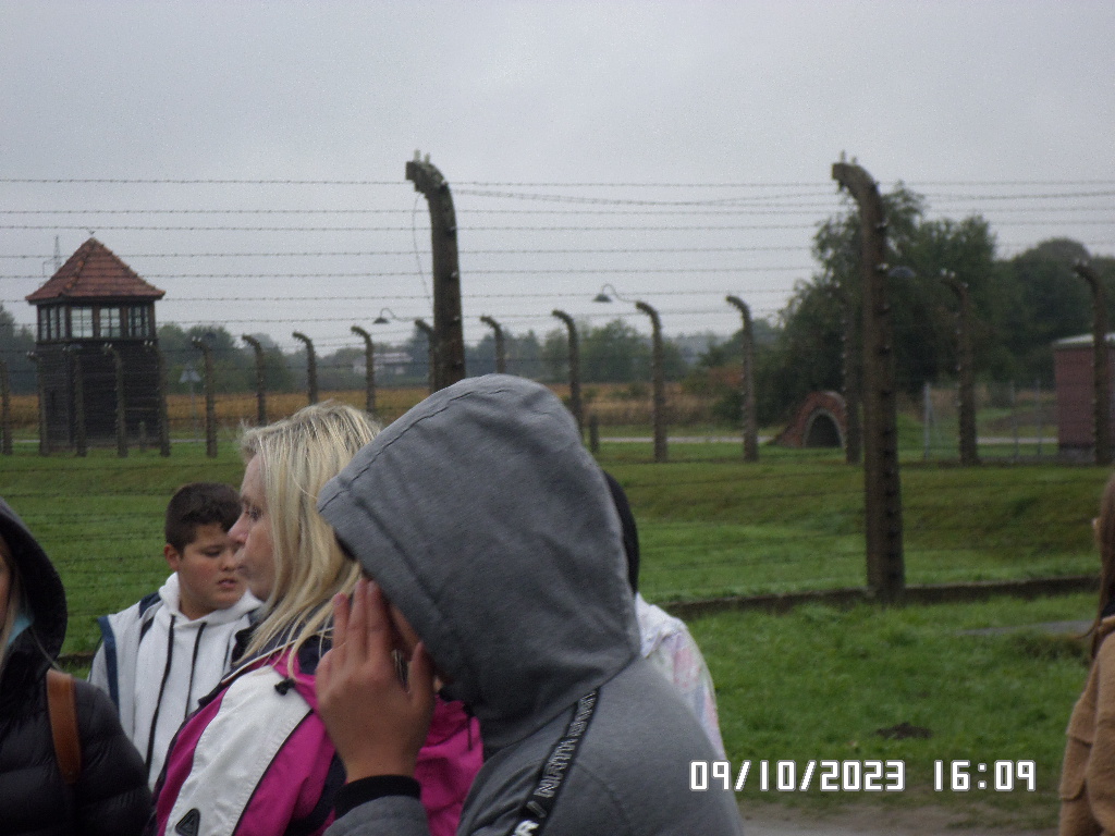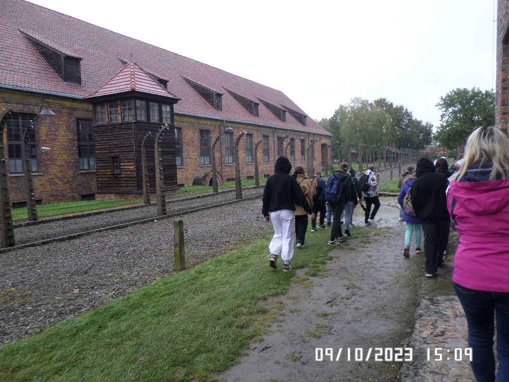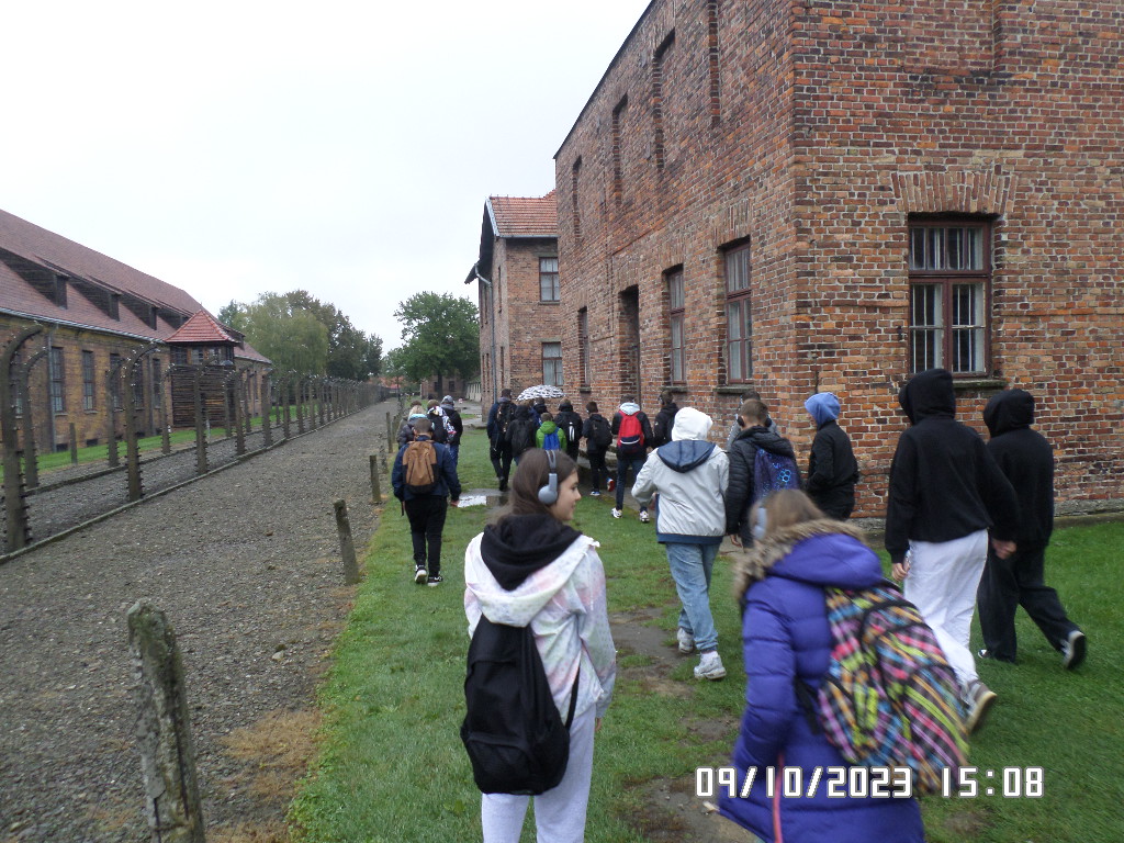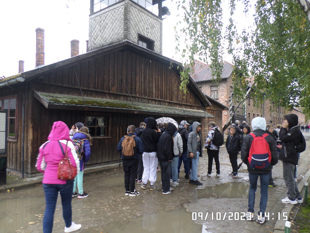 Dalsza część wycieczki to zwiedzanie niektórych miejsc i wystaw na terenie obozu koncentracyjnego Auschwitz Birkenau oraz na terenie obozu w Brzezince. To była trudna i ważna lekcja historii dla uczniów... W ciszy i zadumie słuchali oni informacji przekazywanych przez przewodnika. Te informacje oraz oglądane miejsca, przedmioty i obrazy z obozowego życia więźniów wzbudziły u uczniów wiele emocji, wiele głebokich refleksji, przemyśleń i wiele pytań ... Uczniowie zatrzymali się na chwilę przed ścianą śmierci, gdzie zapalili znicz.