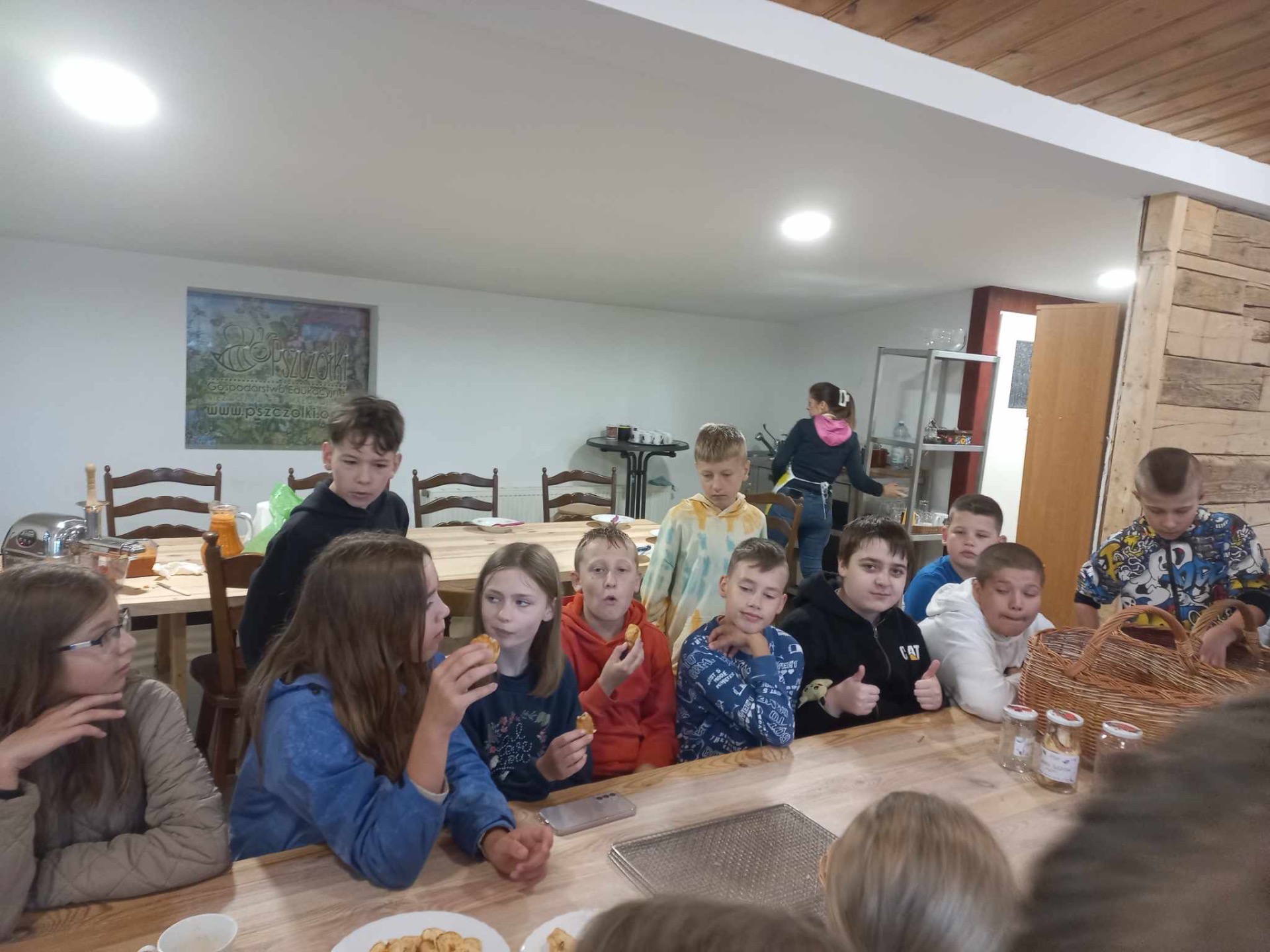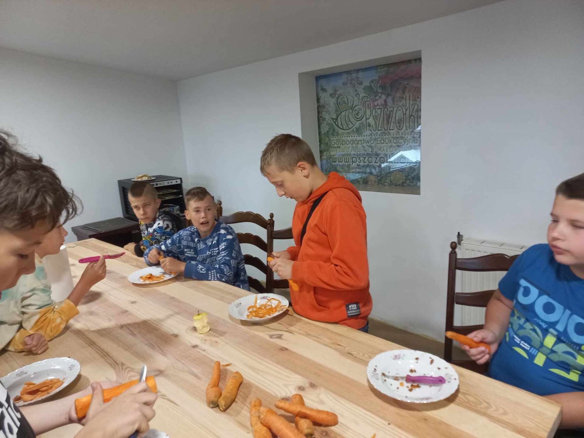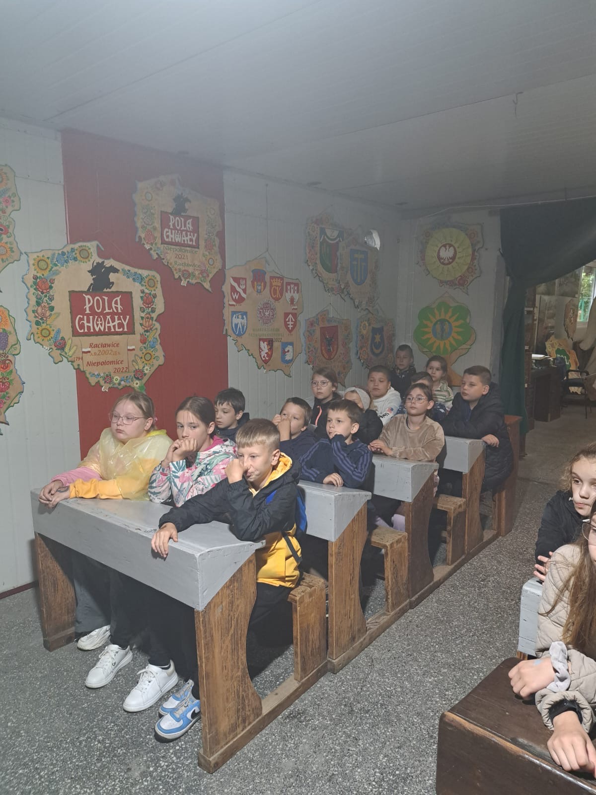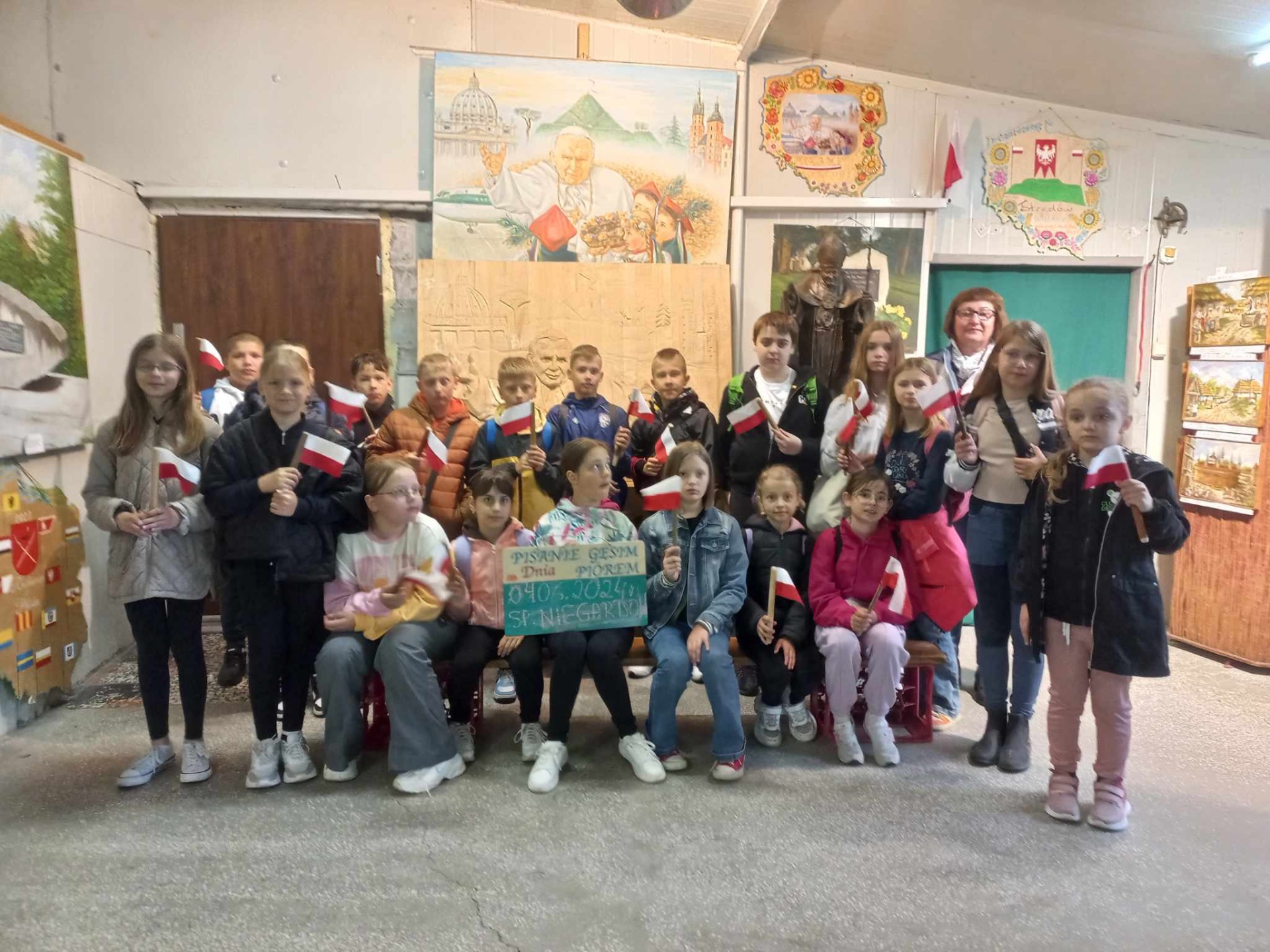 W dniu 4 czerwca 2024 roku uczniowie klas 1-5 odwiedzili Gospodarstwo Edukacyjne „Pszczółki” w Niezwojowicach. Uczniowie podzieleni na mniejsze grupy mieli okazję wziąć udział w zajęciach kulinarnych np. upiec rogaliki, przygotować jabłka do suszenia oraz zrobić sok z marchewki. Uczestnicy wycieczki bardzo chętnie odwiedzili również zwierzęta żyjące w gospodarstwie i zobaczyli ogródek warzywny. Uczniowie brali także udział w lekcji historii. Zwiedzali szkołę z XIX wieku i uczestniczyli w warsztatach pisania gęsim piórem. Każdy z uczestników otrzymał kartę pracy, na której mógł poćwiczyć umiejętność pisania. Karty uczestnicy otrzymali na pamiątkę. Gospodarz zaprezentował jedyną w Polsce makietę Bitwy pod Racławicami. Znajduje się ona na okrągłym, obrotowym stole. Można zobaczyć tam figurki żołnierzy polskich i rosyjskich w skali 1:10, Tadeusza Kościuszkę i Bartosza Głowackiego przy armacie. Widzieliśmy także galerię obrazów związanych z Racławicami. Mimo niezbyt sprzyjającej pogody wszyscy zadowoleni i w dobrych nastrojach wrócili do szkoły.